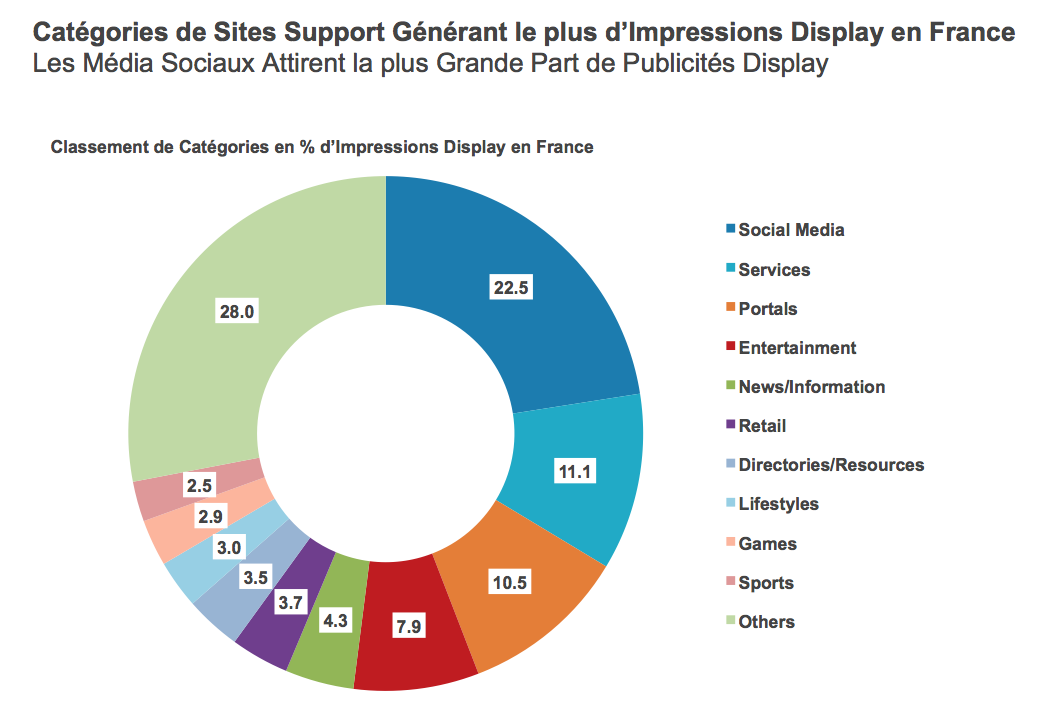 - Les sites de Médias Sociaux attirent la plus grande part des impressions display en France, avec 22,5% des impressions display totales.